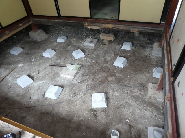 地震で和室の床が盛り上がって、水平に近づける工事をしています。。
