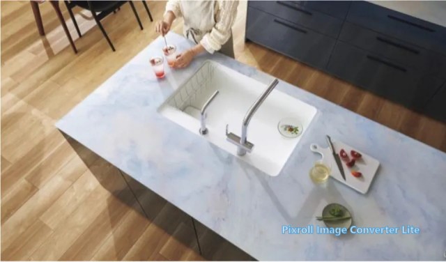 透明感のある美しい見た目で、キッチン全体を明るく上品な印象にしてくれます。傷や汚れが付きにくく、熱にも強いため、見た目だけでなく実用性にも優れています。