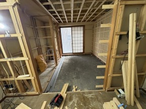 また既存の和室は真壁の為、化粧柱が見えている状態でしたが、化粧柱の上から下地をし柱の見えない大壁に仕上げていきます。