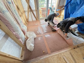 今回は床下断熱はセルローズファイバーによる施工を行いました。