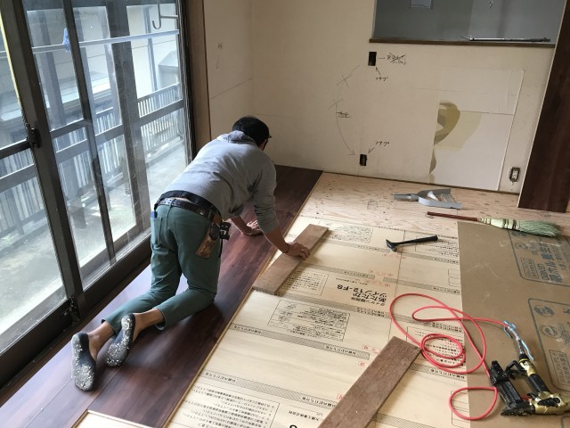 大工さん 仕上げのフローリング張っております