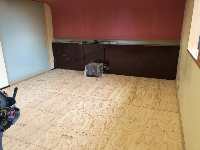 工事内容は既存の20帖の客室床が少し傾いているので畳を撤去して