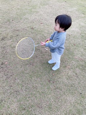正確に言うと、自分が羽を打って息子がラケット持ちながら羽を拾いに行く。