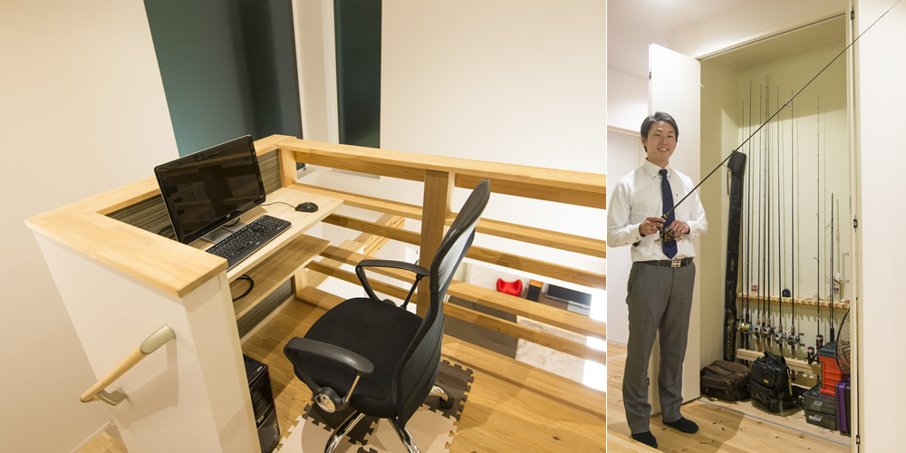 こだわりといえば、1階に僕の趣味である釣りの道具一式を収納する専用スペースを設けたことです。数十本ある釣り竿が美しく収まるよう、大工さんに相談しながら、ぴったりの寸法につくってもらいました。