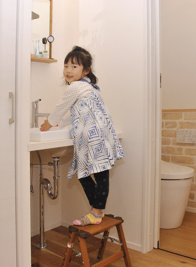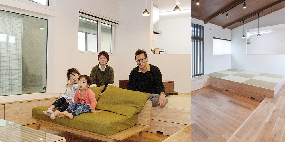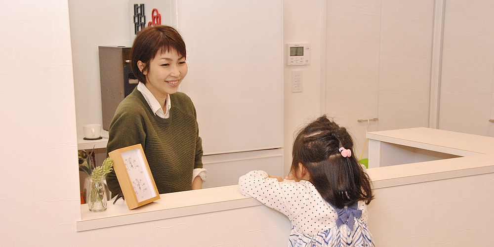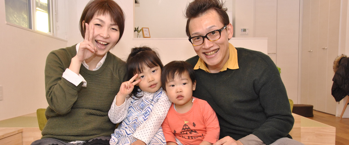 A.この家に引っ越してきた冬は、断熱性が高いので家の中のどこにいても暖かく、家族みんな風邪をひきませんでした。それに、ずっとエアコンをつけていたのに電気代も高くなくて驚きました。サンルームに干した洗濯物の乾きも早く、とっても助かっています。また、前の家では台所とリビングが離れていたので、子どもの様子がわからずに不便だったんです。でも今は料理をしながらリビングが見渡せるので、常に子どもたちの様子がわかりとても安心して家事ができます。それに娘も料理をする私が常に見えるので、今では自然とお手伝いをしてくれるようになりました。そして台所周りの収納もすごく多く、細かいものから普段は使わないものまで片付けられてとっても助かっています。また、リビングの壁に備え付けられた机では、いつも忙しい夫がパソコンで仕事をしていたりと、一つの空間で家族が過ごす時間も増えて、家族で毎日楽しい生活を送れています。