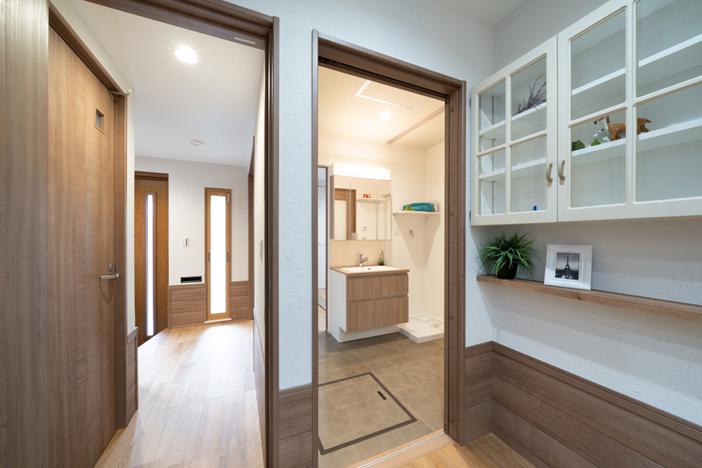 A.廊下を一部削り、各部屋へのアクセスが良くなったうえ、リビングからわざわざ廊下を通らなくても洗面所を通り抜けて仕事場に行けるようにもなってとても楽になりました。一番の悩みだった、部屋ごとの寒暖差もずいぶん解消できました。エアコンを付けておくだけで、お風呂上がりも寒くならなくなりました。1階の断熱効果を上げるため、リビングに面した階段口には引き扉を付けていますが、すりガラスなので2階からの光を取り込めて圧迫感がありません。